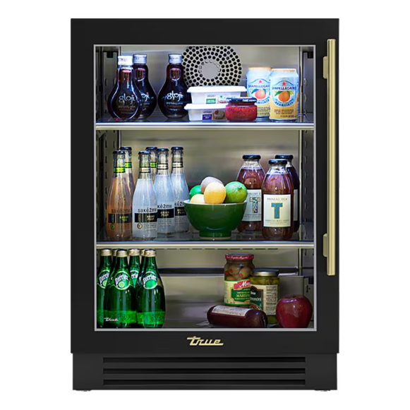 True 24 Inch 5.6 Cu. Ft. Left Hinge Glass Door Outdoor Refrigerator – Matte Black w/ Brass Handles – TUR-24-L-OG-C~DSK-027-H01