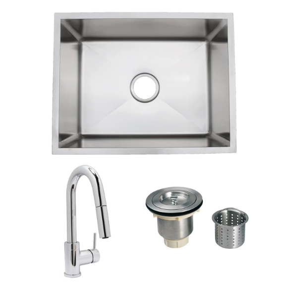 Urban Place Zero-Edge 24 X 19 Stainless Steel Outdoor Sink with Huntington Brass Dual Spray 15.75 Inch High Pull Down Faucet, Grid and Strainer Basket