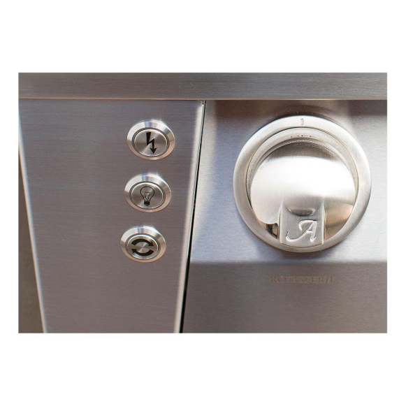 Alfresco brings restaurant-inspired luxury and professional grilling results to your outdoor kitchen with the ALXE grill in Jet Black Gloss. This 42-inch refrigerated cart model gas grill has two (2) high-temperature, titanium and stainless steel blend burners and one ceramic sear zone burner that produce 27,500 BTUs each, for a total of 82,500 BTUs of total cooking power on the grilling surface. The integrated rotisserie system has a 18,500 BTU rear ceramic infrared burner and a whisper-silent motor with a chain-driven spit that has 120 pounds of turning torque. The rotisserie spit rod can be conveniently stored under the bullnose of the drip tray when not in use. Grill also features a 5,000 BTU smoker system with a stainless steel burner that ejects smoke at 200 degrees onto your grill and a smoker drawer that is large enough to hold peppers, herbs, and wood chunks and is sealed to hold liquids as well. Unique pyramid-shaped ceramic briquettes eliminate hot spots and maximize flavor as they evenly deliver heat to the cooking surface. An air-cooled front control panel keeps your knobs and control panel cool while grilling, protecting both the equipment and your hands from high heat. The 600 degree heat-resistant silicone sleeves protect the electrical wires of the grill. This natural gas grill has a spacious 770 square inches of actual grilling area, double-lined hood for durability, a removable 3-position warming rack, and heavy-duty rolled stainless steel cooking grids capable of providing perfect steakhouse results. This Alfresco grill is also equipped with a refrigerated cart that features all-welded commercial stainless steel construction, 4 cubic ft door section, dual drawers with removable stainless steel food pans and a compact, commercial compressor system. ALXE model grills also feature rich amber LED front panel lights, stainless steel push button ignition, lighting and rotisserie controls, a new torsion spring-assisted hood system, and nickel-plated, ergonomically-designed knobs and bezels. This all-American made grill has a grill cover included.