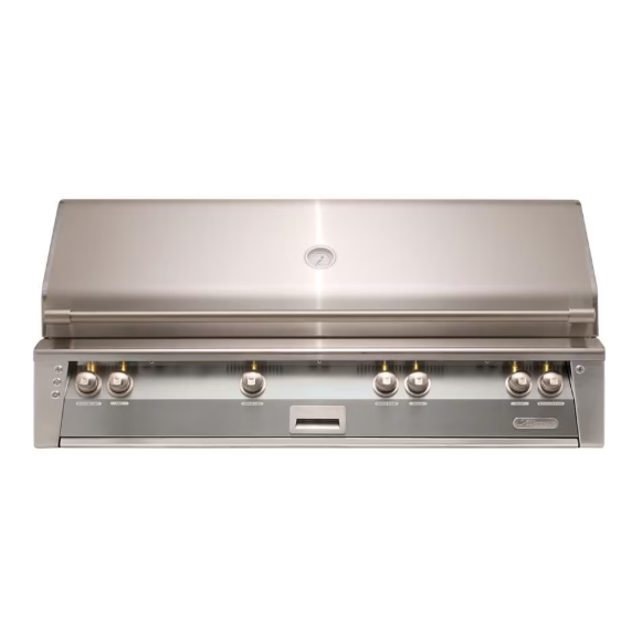 Alfresco brings restaurant-inspired luxury and professional grilling results to your outdoor kitchen with the ALXE grill. This 56-inch built-in gas grill has three (3) titanium and stainless steel blend burners that produce 27,500 BTUs each, for a total of 82,500 BTUs of total cooking power on the grilling surface. Grill also features 27,500 BTU ceramic sear zone burner that reaches 1500 degrees in four minutes and cooks 50 percent faster, sealing in juices with virtually no flare-ups and has a specially designed V-shaped grate that captures juices, fats, and flavors, and caramelize them to your food. The integrated rotisserie system has a 15,000 BTU rear ceramic infrared burner and a whisper-silent motor with a chain-driven spit that has 120 pounds of turning torque. Grill also features a 5,000 BTU smoker system with a stainless steel burner that ejects smoke at 200 degrees onto your grill and a smoker drawer that is large enough to hold peppers, herbs, and wood chunks and is sealed to hold liquids as well. Unique pyramid-shaped ceramic briquettes eliminate hot spots and maximize flavor as they evenly deliver heat to the cooking surface. An air-cooled front control panel keeps your knobs and control panel cool while grilling, protecting both the equipment and your hands from high heat. The 600 degree heat-resistant silicone sleeves protect the electrical wires of the grill. This propane gas grill has a spacious 973 square inches of actual grilling area, double-lined hood for durability, a removable 3-position warming rack, and heavy-duty rolled stainless steel cooking grids capable of providing perfect steakhouse results. ALXE model grills also feature rich amber LED front panel lights, stainless steel push button ignition, lighting and rotisserie controls, a new torsion spring-assisted hood system, and nickel-plated, ergonomically-designed knobs and bezels. This all-American made Alfresco ALXE 56-Inch Built-In Propane All Grill With Sear Zone And Rotisserie in Signal Gray has a grill cover included.