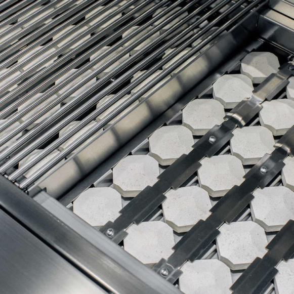 • Ceramic briquette trays minimize flare-ups and provide even heating