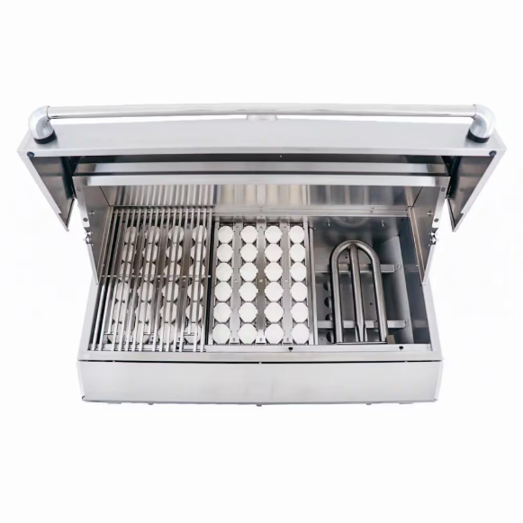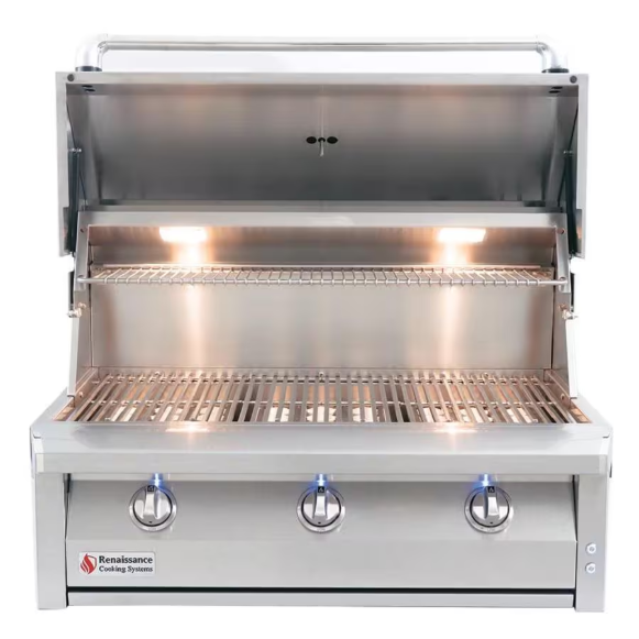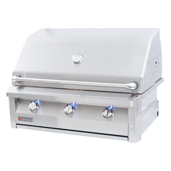 The American Renaissance Grill by RCS 36-inch propane gas freestanding grill is made in the USA and boasts 304 stainless-steel construction to ensure your new grill will stand the test of time! Three stainless-steel U-shaped burners give you 25,000 BTUs each for a total of 75,000 BTUs. The control knobs feature blue LED lights, while the grilling area has dual internal halogen lights, making sure you are never in the dark when grilling in the evening. The 3 ceramic briquette trays will distribute the heat evenly while burning the drippings, infusing your food with flavor. The exclusive Searmax heavy-duty square bar cooking grids are built to last with a 647 Sq. In. main cooking area, and a fold-away warming rack providing a secondary cooking surface of 264 Sq. In., for a total cooking surface area of 911 Sq. In. Rotisserie rod bearings are mounted to the grill, ready for you to get your rotisserie going. The spring-loaded hood with the analog temperature gauge ensures that you will not ever have a problem monitoring your cook. The cart features folding shelves, dual storage drawers, an access door with on door storage, a regulator access panel, and 3-inch locking caster wheels for easy portability.