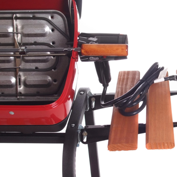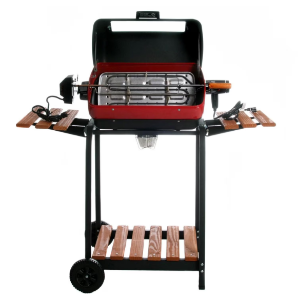 This Americana by Meco electric grill has a 1500-watt heating element that plugs into a standard household outlet. This electric grill features an easy-view window, a thermostat control with a low-medium-high setting, a reflector pan that directs heat to the cooking surface, and a pre-assembled grill hood and bowl. The three-position cooking element provides a versatile cooking experience by allowing direct and indirect cooking as well as rotisserie cooking when the element is turned to a full vertical position. The 22-Inch rotisserie kit includes the spit rod, forks, motor and brackets. The porcelain-coated cooking grate provides 202 square inches of usable cooking surface. The sturdy steel cart features two wheels, two handy fold-away side tables made to look like real wood, and a lower shelf for extra storage. The hood is equipped with a stay-cool wooden-like handle so there’s no need to reach for the oven mitt every time it’s time to flip your bugers. This grill is safe, simple, easy to clean, and just the right size to accommodate many spaces. This grill requires a minimum of 15 amps and standard 120-volt grounded plug. Americana by Meco electric grills are UL-listed (Canada: CUL-listed) and for outdoor BBQ use only! Manufactured in Greeneville, TN USA with Domestic & Imported components.