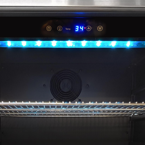 This Artisan Left Hinge Refrigerator features a 304 stainless steel exterior construction, 5.5 cubic feet of interior storage space with adjustable stainless steel wire shelves. The programmable digital thermostat allows you to set the temperature from 34 to 54 degrees Fahrenheit and has auto-defrost. The graphite interior is illuminated by blue LED lighting. Front, bottom venting allows for both freestanding and built-in applications. When not in use, this refrigerator has a lock to keep it securely closed. A towel bar style handle and adhesive Artisan badge are included to complete the unit.