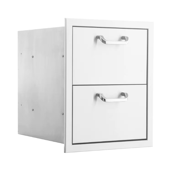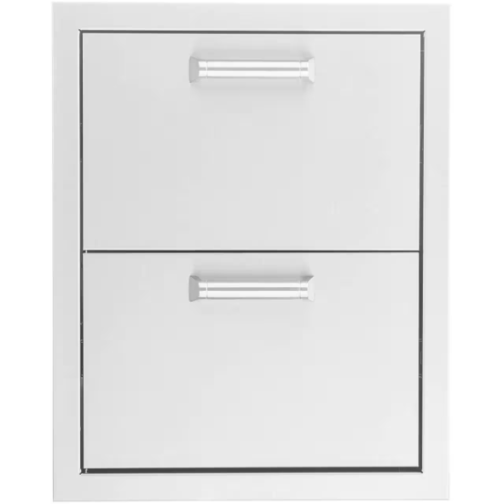 This BBQGuys Signature 16-in stainless steel double access drawer is constructed with a 20 gauge 304 stainless steel frame and number 4 brushed finish. Unit is flush mounted, and the drawers use heavy-duty, commercial grade ball bearing drawer glides on full length drawer tracks for easy opening and closing. An access drawer is the perfect outdoor kitchen accessory for any outdoor BBQ island, adding storage space for your tools and spices. BBQGuys Signature outdoor kitchen components are designed without a logo, so you can pair them with any brand of grill or outdoor kitchen appliance. Traditional and contemporary-style handles are both included, and they require installation on this double access drawer. Product does not include installation hardware or instructions. Internal Drawer Dimensions: 13 7/8 W X 19 3/8 D X 7 3/4 H.