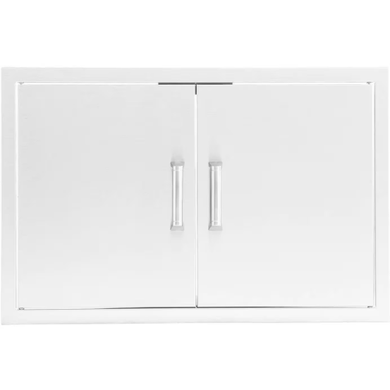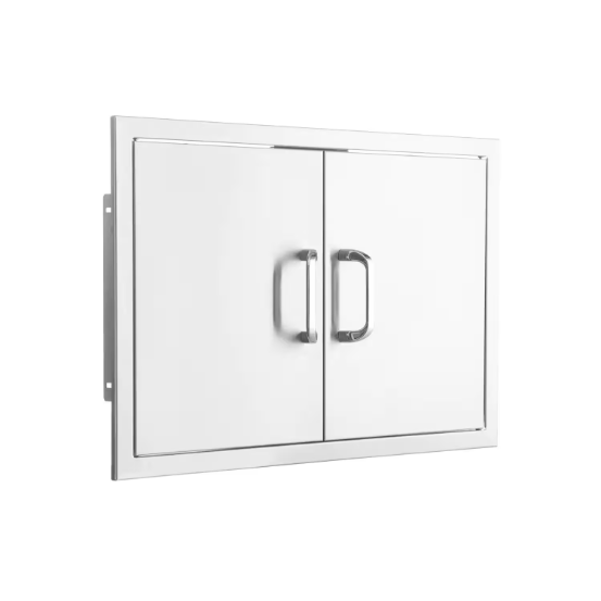 This BBQGuys Signature 25-in stainless steel double access door is constructed with a 20 gauge, 304 grade stainless steel frame and number 4 brushed finish. This unit is flush mounted for a streamlined appearance. An access door is the perfect outdoor kitchen accessory for any outdoor BBQ island, providing storage space and access to the underside of grills and side burners. BBQGuys Signature outdoor kitchen components are designed without a logo, so you can pair them with any brand of grill or outdoor kitchen appliance. Traditional and contemporary-style handles are both included, and they require installation on the double access door. Product does not include installation hardware or instructions. Door Opening Dimensions: 18 3/4 W X 17 7/8 H.