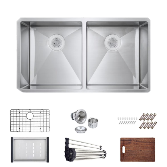 Handcrafted from superior 16-Gauge Stainless Steel, the Bryn collection of kitchen sinks combines an aesthetic style with easy to clean 3/8-Inch corners that prevents food traps. Our optimized bottom slope with channel grooves directs water and debris down the drain while keeping your dishes and glasses upright. Beyond incredible durability and corrosion resistance, which ensures a sophisticated look throughout a lifetime of use, our sinks can be installed either undermount or top mount with any counter. Workstation package includes a Roll-Up Mat, Stainless Steel Strainer, Cutting Board, Wire Grid, Basket Strainer Drain, and Mounting Hardware.
