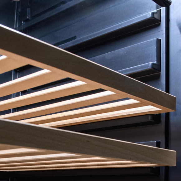 3 Beech shelves and 3 glass shelves can be configured for personalized aesthetics