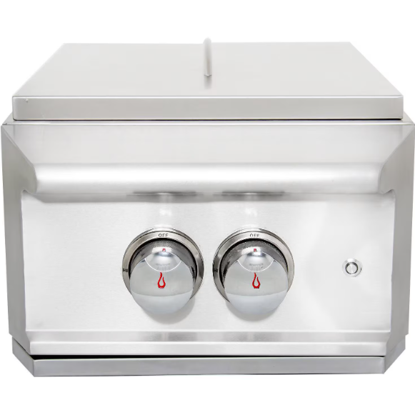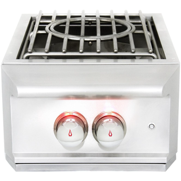 Introducing an affordable power burner that incorporates a narrow footprint and an efficient design which boils water in half the time as other power burners on the market. At 15 3/4 inches wide, the Blaze Professional LUX Power Burner gives you more room for additional components or more counter space for prepping and other tasks. Blaze power burners are made from stainless steel and include a removable stainless steel lid to protect the burner when not in use. The cooking grid is constructed from heavy-duty stainless steel rods with a removable 9-inch inner ring for cooking with a wok. Underneath the grid, a stainless steel guard surrounds the burner, which protects it from the wind and concentrates heat for maximum efficiency. This propane gas power burner features two, individually controllable burner rings. The inner ring is rated for 25,000 BTUs, and the outer ring is rated for 35,000 BTUs. The burners are lit with a simple push and turn ignition. This dual ring design is ideal for cooking versatility. The inner burner is great for simmering sauces, or use both burners when boiling shrimp or frying fish. Cooking with the outer ring is perfect for large skillets and pans, as the high heat allows the pan to heat up quickly. The burner ring is made from commercial quality, 304 cast stainless steel for longevity. This power burner also sports red LED control knob illumination for cooking and entertaining at night. If you are looking for an affordable power burner so you have more in your budget for other components, Blaze power burners are a great solution. A power transformer is included for the lights.