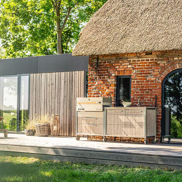 The BurnoutBBQ M Island in smoke is made in Germany and includes everything you need for a complete outdoor kitchen. The sleek European design is the perfect combination of form and function providing abundant storage including propane tank storage, waste bins, and storage drawers. Durable colorfast stainless steel construction and strong Dekton countertops ensure years of enjoyment. The BurnoutBBQ M Island includes a ZWILLING Flammkraft Model D Built-In Grill, featuring innovative infrared technology. With an award winning desgin and versatile infrared burners allowing for the creation of individual cooking and heating zones while the included heavy-duty rotisserie expand the possibilities when cooking outdoors.When you purchase the BurnoutBBQ M Island with the Zwilling Flammkraft Model D Built-In Grill, you can spend less time building your outdoor kitchen and more time enjoying your outdoor kitchen.