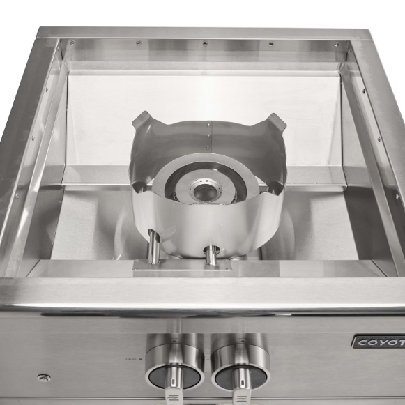 The Coyote 24 inch Built-In Natural Gas Power Burner is designed for high-performance outdoor cooking providing up to 60000 BTUs of intense heat output. With a dual-valve system this burner offers precise temperature control allowing for both powerful searing and low-temperature simmering at 8100 BTUs.