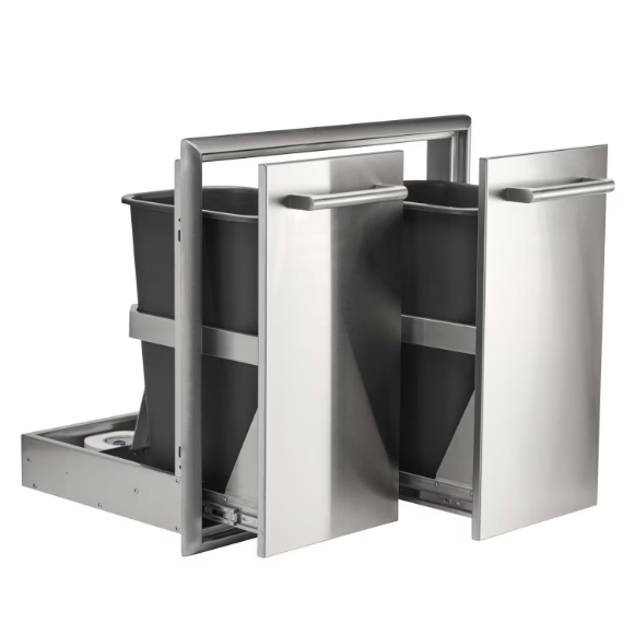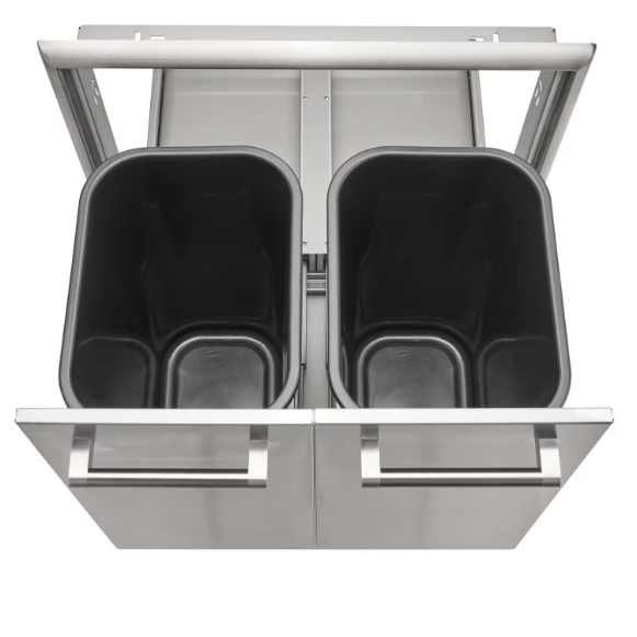 The Coyote 26 inch Pull-Out Trash and Recycle Drawer keeps waste and recycling discreetly stored while maintaining a sleek built-in appearance. Featuring two dedicated drawers each with a 13-gallon trash bin this unit ensures organization and convenience.