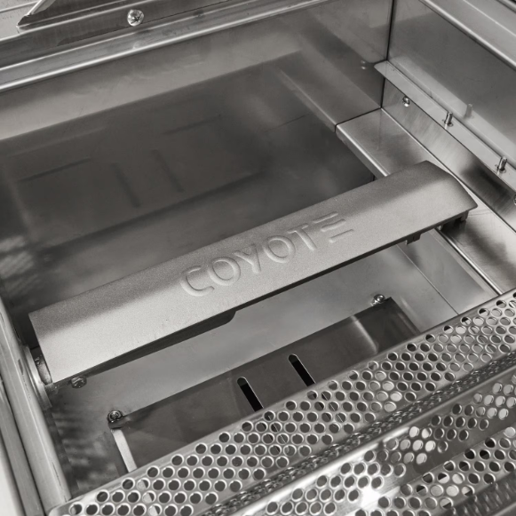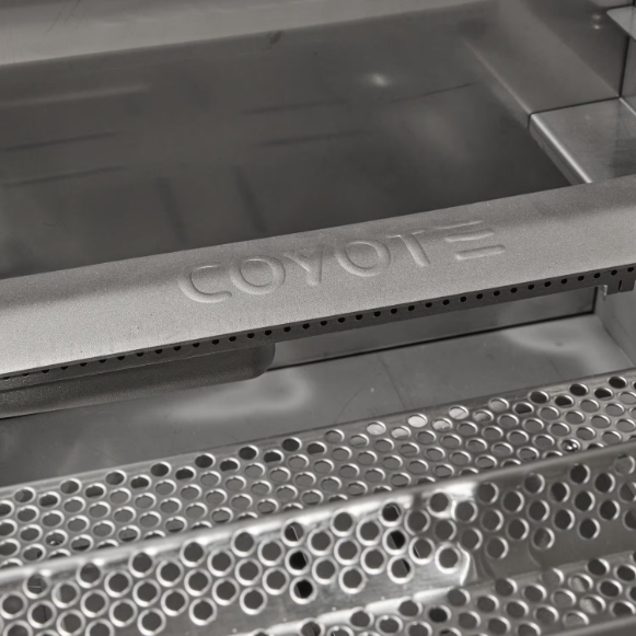 The Coyote natural gas & charcoal hybrid grill offer unmatched versality for the cooking enthusiast. Featuring two high-performance I-Burners, this hybrid grill delivers 30,000 BTUs of cooking power, while the integrated charcoal tray allows for traditional grilling with lump charcoal or wood chips. The heavy-duty stainless-steel frame withstands outdoor elements, while self-closing doors and drawers ensure secure storage. Industrial-quality casters provide smooth mobility, and fold-down shelves expand workspace as needed. A built-in slide-out propane tank shelf simplifies fuel management, making this cart a must-have for outdoor cooking enthusiasts.