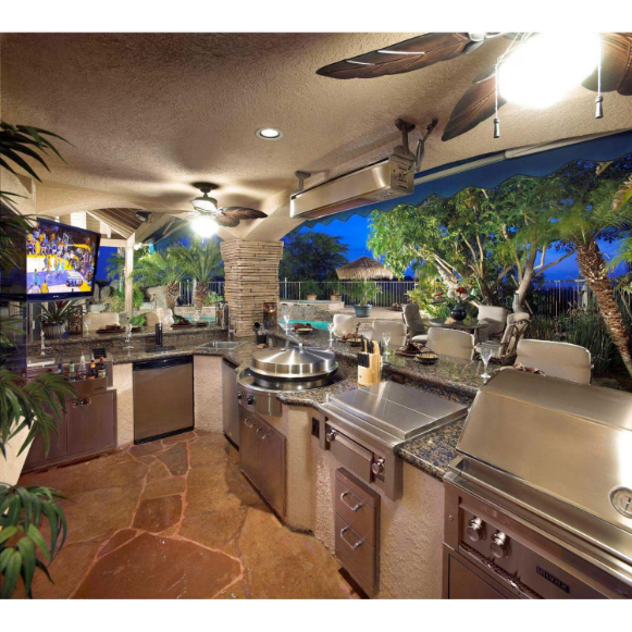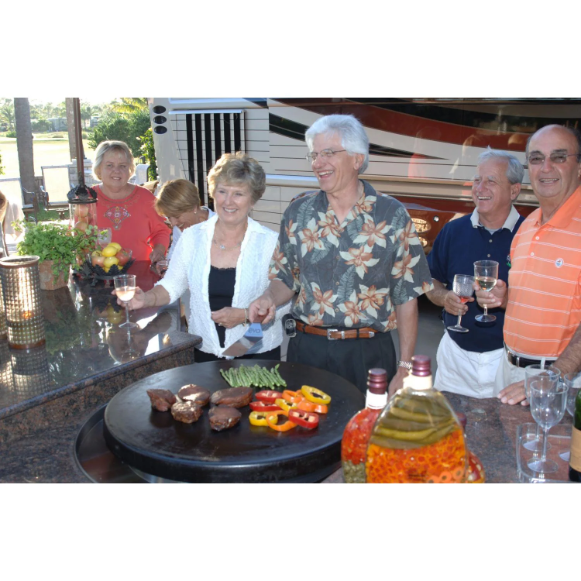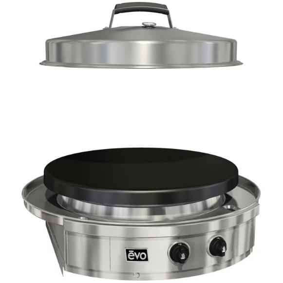 This Evo Affinity 30G Gas Grill is the perfect solution for entertaining your family and friends. Its the first outdoor BBQ grill that allows you to cook directly and indirectly at the same time. If you are cooking directly, you can sear, saute, grill, toast and stir-fry. Indirectly, you can boil, braise, poach or fry. And by covering the cooking surface with its stainless steel hood, the Evo Affinity 30G grill becomes a patio oven for roasting, steaming, warming or smoking. No other grill lets you be this creative outdoors. This Evo Affinity 30G Outdoor Grill features a solid 3/16 inch oil-seasoned non-stick steel cooking surface that is 30 inches in diameter and 650 total sq. inches, an enclosed stainless steel dual burner system ranging from 225 to 700 degrees with 40,095 BTUs from the center to the outside for edge to edge heat control, a heavy duty stainless steel frame, housing, and control panel along with a stylish hood that has a built-in stainless steel thermometer and adjustable vent. Also, this Evo Affinity 30G Cooktop has an easy start up electronic (battery operated) spark ignition that allows you to light one or both burners simultaneously, a stainless steel drip pan around the cooking surface that catches any spillovers from falling, and two front mounted drawers with removable waste trays on each side that are dishwasher safe. A full color cookbook with over 50 recipes and useful tips for cooking on the Evo is included. This is one of the easiest grills to clean and maintain, simply scrape and wipe down the surface and it looks brand new. From a delicious pancake and bacon breakfast to the juiciest seared steaks that you have ever tasted, this Evo Affinity 30G flat top grill can do it all.