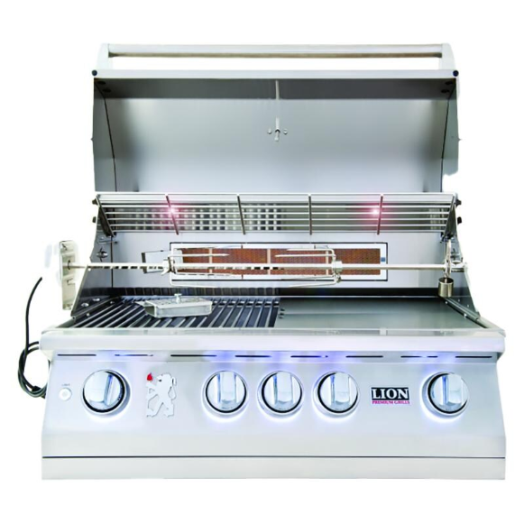 Lion demonstrates their gourmet grilling expertise with the L75000 propane gas grill. This stainless steel 32-inch BBQ grill has all the features and flare required to get your backyard barbecuing experience started. Five Lion Quick Lite valves ensure a fast, steady flame for grilling startup, and push-to-turn knob design simplifies operation. Commercial grade 304 stainless steel construction promises an unbreakable grill in your backyard. The double layer, seamless welded, stainless steel grill head with polished edges delivers durability to your grilling area. Four cast stainless steel burners push 60,000 BTUs of cooking power on the grilling surface, and a 15,000 BTU infrared rotisserie back burner adds fuel to the fire! An XL temperature gauge makes monitoring your meal simple, and the two interior lights illuminate the interior grilling area so you can enjoy grilling late into the evening. Premium solid stainless steel cooking grates resist wear and tear, and provide 647 square inches of grilling space. Experience the benefits of a grilling gourmet package with the included rotisserie, cover, smoker box, griddle and griddle remover with bottle opener.