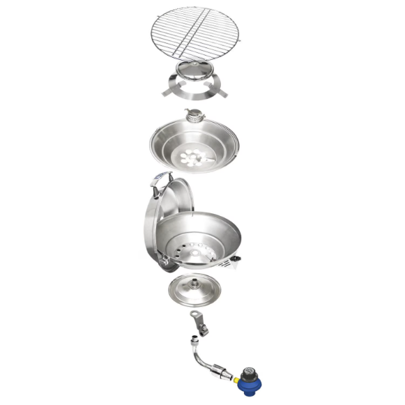 The Magma original size Marine Kettle 3 combination stove and gas grill is constructed with 304, 18-8 mirror-polished stainless steel with marine grade qualities that add superior corrosion resistance and is less prone to rust. This grill features an electronic ignition system, stainless steel burner and grates, and a virtually blow-out proof turbo venturi tube design, all wrapped up in a heavy-duty safety shell that keeps the outside of the kettle cool while protecting it from discoloration. Quickly achieve hot, even temperatures and reduce the amount of flare ups with the special radiant plate heat distribution design and convection heating. Grill burgers, sear steaks, or even try your hand at baking or roasting at sea. Enjoy stress-free mounting with the cast stainless steel L-bracket and clamp assembly. The included round rail mount is also constructed from 18-8 stainless steel and 356 anodized aluminum to endure the elements. The quick-disconnect design allows for easy removal and leaves no hardware on the rail. Made with quality and durability in mind, the original Marine Kettle 3 combination stove and gas grill helps you combine your loves of fresh BBQ and sunny days above the waves.