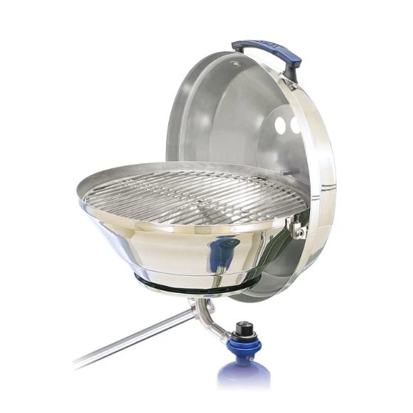The Magma Original Size Marine Kettle Gas Grill is constructed with 304, 18-8 mirror-polished stainless steel with marine grade qualities that add superior corrosion resistance and is less prone to rust. Designed for the grill master on the open water, the Kettle is ideal for grilling up some burgers or dogs with your pals or, if you are feeling fancy, even searing a steak. Worried about blow-outs on the windy seas? Magma has you covered! The turbo venturi tube and stainless steel burner feature a windproof design that prevents blow outs. The tube also swivels, which adjusts the control valve to whatever setting you need. The Marine Kettle also features a balanced hinged lid which could double as a windshield when things get gusty. The included round rail mount is also constructed from 18-8 stainless steel and 356 anodized aluminum to endure the marine elements. The quick-disconnect design allows for easy removal and leaves no hardware on the rail. Designed with quality and durability in mind, the original Marine Kettle helps you combine your loves of fresh BBQ and sunny days above the waves.