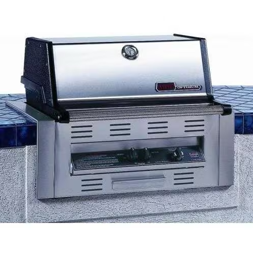 This MHP propane gas grill features a high profile stainless steel lid with solid aluminum end-caps for greater stability and accommodates large cuts of meat and features a Sta-Kool handle which rolls to make opening the hood easy. The two (2) SearMagic cooking grids offer 433 1/2 square inches of cooking area. The anodized aluminum SearMagic cooking rack is reversible with one side wide-ribbed for grilling steaks, chops, burgers or ribs and giving them sear lines. Flip it over and its smooth surface is perfect for fish, vegetables or even breakfast foods such as French toast. The 40,000 BTU stainless H-type dual burner has burner ports that are uniform in size and shape with even flames on each port providing superior cooking performance. The FlavorMaster long lasting porcelain briquettes provide constant precisely controlled heat and true barbeque flavor and the heavy duty rock grate has a fused on rust resistant porcelain finish. Includes commercial grade stainless enclosure sleeve to encompass the grill head for a neater and more of a finished look to the built-in installation.