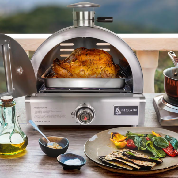 The Mont Alpi table top pizza oven is a great addition to any patio, RV or Camp site. Elegant and functional. This oven gets to heat in no time and cooks gorgeous flame fired pizza in under 5 minutes. Also great for baking outside, use as your outdoor patio or camping oven. This unit performs exactly the same as your indoor oven would. Roast a chicken, joint of beef or the thanksgiving Turkey on this phenomenal piece of equipment. Enhance your patio, outdoor island or camping experience with this award winning and versatile oven.