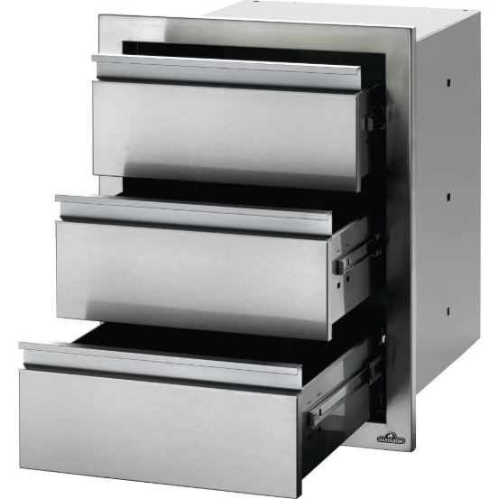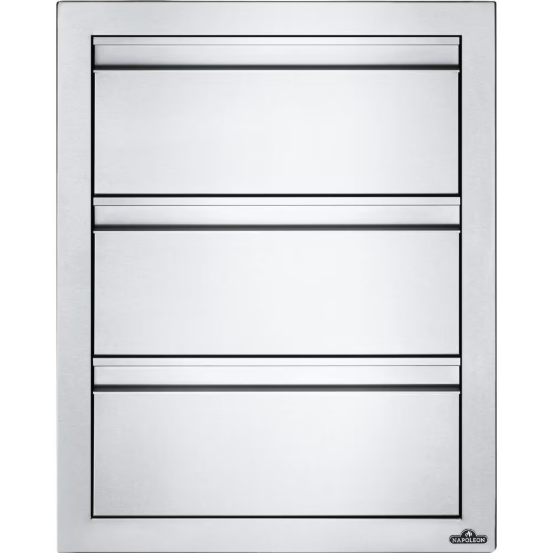 Customize your outdoor grill island with Napoleon built-in components. Measuring 18 inches wide by 24 inches high, this stylish stainless steel triple drawer gives you the added storage that every outdoor kitchen needs with three 8 Inch drawers. Anodized aluminum handles pair with soft closing hardware to provide durability and comfort. The seamless trim provides flexible and flawless installation. You know you can expect quality when Napoleon has their named stamped subtly into the side of this sliding drawer. These built-in storage components are ideal for any outdoor kitchen.