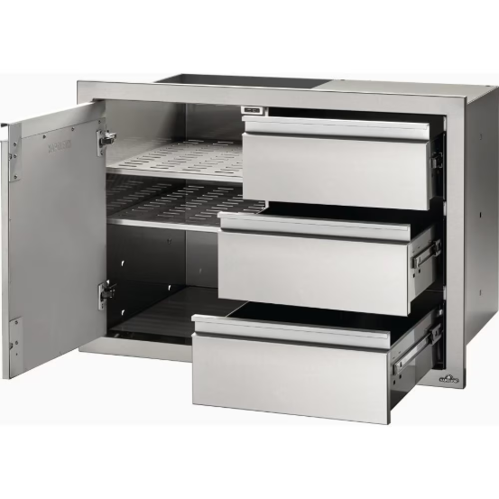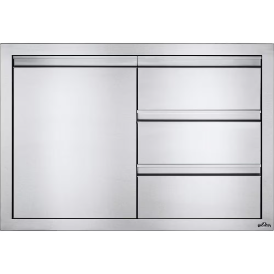 Customize your outdoor grill island with Napoleon built-in components. Measuring 36 inches wide by 24 inches high, this stylish stainless steel single door and triple drawer combo gives you the added storage that every outdoor kitchen needs. Anodized aluminum handles pair with soft closing hardware to provide durability and comfort. The seamless trim provides flexible and flawless installation. You know you can expect quality when Napoleon has their named stamped subtly into the side of this sliding drawer. These built-in storage components are ideal for any outdoor kitchen.