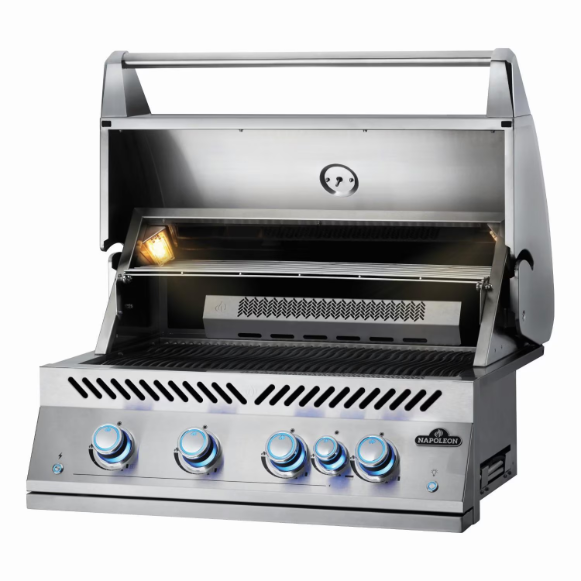 The Napoleon Built-In 700 Series 32-Inch Natural Gas Grill w/ Infrared Rear Burner & Rotisserie Kit provides the high-quality grilling you have come to expect from Napoleon’s gas barbecues. Built seamlessly into your ideal outdoor kitchen, the premium stainless construction ensures stylish longevity and unparalleled performance. Thick, 9-mm stainless steel cooking grids are virtually maintenance-free. Enjoy ambiance and safety while grilling, the control knobs glow blue, changing to red when burners are in use. Grilling past dark is a joy with the integrated halogen interior hood lights to illuminate your grilling surface. Angular grease management with a perforated design, channels drippings for improved grease collection and ease of cleaning, reducing buildup and risk of grease fires. The Built-In 700 Series 32-inch Gas Grill has been designed specifically for ease of installation with integrated trim, an extra long flex line, and longer electrical wiring for zero design and functionality restrictions on install.