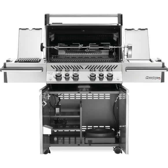 The Napoleon Legacy Prestige PRO 500 blends quality and performance into one package, and has the features to make every cooking experience exceptional. This freestanding propane gas grill has four stainless steel tube burners that provide up to 48,000 BTUs of cooking power. The grill has stainless steel cooking grates with 500 square inches of main cooking area and 400 square inches across the stainless steel warming area for a total of 900 square inches of cooking area. Easily turn the burners on with flame ignition for a reliable start up. The stainless steel wave cooking grids create the trademark Napoleon sear lines. The stainless steel, self-cleaning sear plates vaporize drippings, control flare ups and keep your food moist. The Prestige PRO 500 also has a 18,000 BTU stainless steel rear infrared burner for slow cooking with the rotisserie kit and a 14,000 BTU infrared side burner for searing meats. The hood features an Accu-Probe temperature gauge, stainless steel end caps and retains heat for oven-like performance. The LED Spectrum Night Light control knobs have near limitless color options making your night time entertaining a breeze, and they glow red when a burner is in use while two interior lights illuminate the grilling surface. A full width drip pan also makes clean up a breeze. The stainless steel grill cart also features a built-in ice bucket and double doors with soft close for storage and easy roll locking casters for moving the grill around. This Napoleon grill is manufactured in Canada.