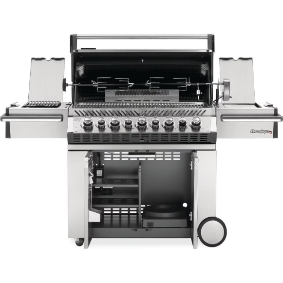 The Napoleon Legacy Prestige PRO 665 brings engineered quality at an economical price to your grilling experience. This freestanding propane gas grill has five stainless steel tube burners that provide up to 60,000 BTUs of cooking power. The grill has stainless steel cooking grates with 665 square inches of main cooking area and 335 square inches of warming area for a total of 1000 square inches of cooking area. Easily turn the burners on with flame ignition for a reliable start up. The stainless steel wave cooking grids create the trademark Napoleon sear lines. The stainless steel, self-cleaning sear plates vaporize drippings, control flare ups and keep your food moist. The Prestige PRO 665 also has a 18,000 BTU stainless steel rear infrared burner for slow cooking with the rotisserie kit and 13,000 BTU infrared side burner for searing meats. An integrated wood chip smoker tray pulls out for easy filling and has a dedicated 8,000 BTU burner that creates delicious smoke flavor. The hood features an Accu-Probe temperature gauge, stainless steel end caps and retains heat for oven-like performance. The LED Spectrum Night Light control knobs have near limitless color options making your night time entertaining a breeze, and they glow red when a burner is in use while two interior lights illuminate the grilling surface. Clean up is a cinch with the full width removable drip pan. The stainless steel grill cart features an integrated ice bucket, cutting board, side shelves and double doors for storage and easy roll locking casters for moving the grill around. Minimal assembly required because the grill cart comes fully assembled with the exception of the cart side shelves and the grill head. Please note, due to the weight of this item white glove delivery service is not available. This Napoleon grill is manufactured in Canada.