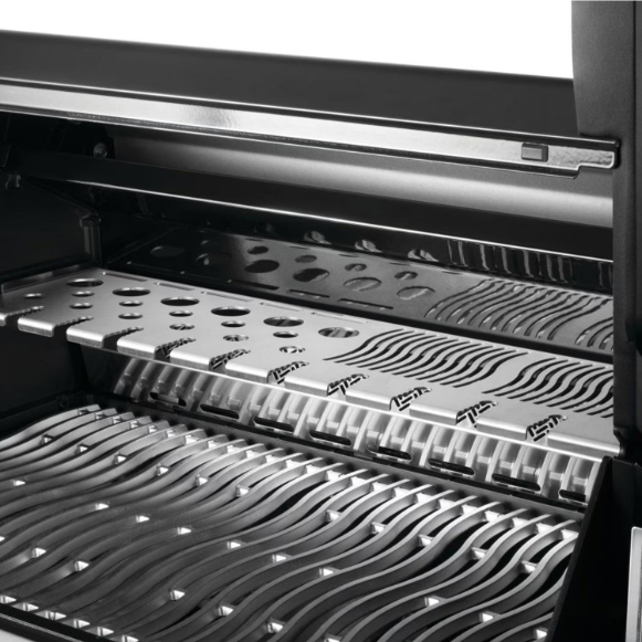 Napoleon’s staggered stainless steel sear plates vaporize drippings to intensify flavor while minimizing flare-ups. Their dual-level design also improves heat distribution across the grilling surface.