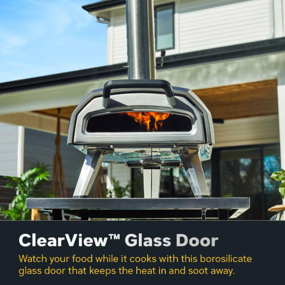 • ClearView technology prevents soot and ash buildup on the borosilicate glass door for a clear view of your pizza as it cooks