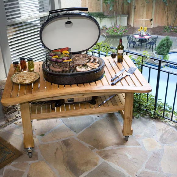 Choose Primo and experience the best in kamado style charcoal cooking. The Primo Oval XL Charcoal Smoker Grill is an extra large sized grill and one of the biggest ceramic cookers on the market. The distinct shape of the Oval XL allows you to cook using direct or indirect heat, expanding your grilling options unlike any other kamado-style grill. This grill features easy to clean and reversible stainless steel cooking grates, as well as one of the highest sitting lids which is great for cooking whole chickens or turkeys. This kamado style grill is made in the USA, unlike its competition, and constructed with premium grade Primo SuperCeramics and coated with a protective, lead-free, and scratch-resistant porcelain glaze. The patented Primo Oval XL efficiently retains and evenly distributes heat across the 400 square inches of cooking surface, perfect for maintaining a consistent temperature. Smoke meat at temperatures as low as 180 degrees Fahrenheit, or turn up the heat to more than 500 degrees Fahrenheit for searing and grilling. Use the 6-position cast aluminum chimney cap, 5-position stainless steel lower vent door, and easy to read thermometer for monitoring and keeping a precise temperature. The chimney cap also features a hood to keep out rain for all-weather grilling. The easy lift-and-lock hinge system keeps the lid raised in place, now requiring 70-percent less force to open than previous models. A soft-close felt gasket protects the ceramic while opening and closing the lid using the newly designed cool touch handle, now featuring integrated retaining clips to help keep the ceramic top firmly in place. The included ceramic feet safely elevate your grill away from the combustible surface of the table, which is constructed by hand from durable cypress wood. The curved design of the cypress table makes it easy for you to get in close to the grill. At 61 inches wide, the table provides plenty of workspace for prepping food and room to store ingredients and grilling tools, while tastefully showcasing your Primo grill. Four revolving and lockable caster wheels roll smoothly on any patio surface and lock in place when you are ready to grill. The variety of accessories available, along with the unique oval shape, allows flexibility in cooking a never ending list of delicious meals. Choosing a Primo kamado style grill is a decision you will never regret.