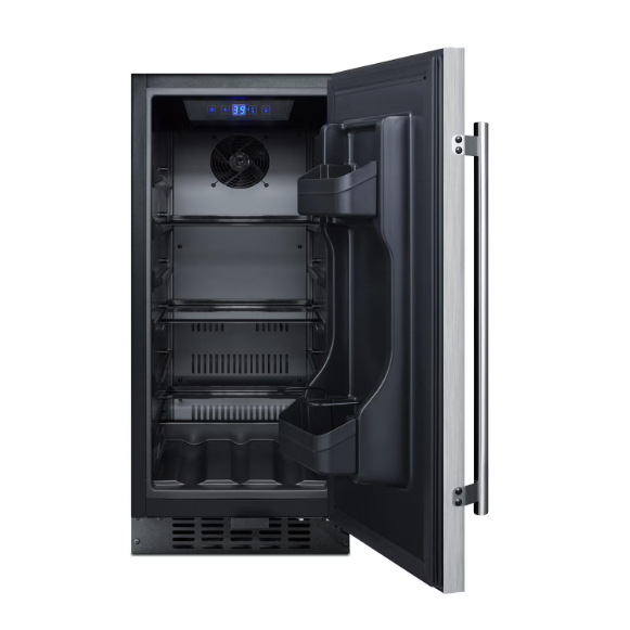 With innovative design and superior construction, Summit refrigeration products are finely crafted inside and out. This commercially approved 3. 0 cubic foot outdoor beverage refrigerator features a digital thermostat on the inside of the unit for precise temperature control. The inside of the beverage cooler also features a fan to circulate the air inside the unit maintaining an even temperature throughout. The three adjustable glass shelves allow for multiple storage options and the bottom on the unit has three floor slots for wine bottles. The recessed LED lighting provides an elegant touch, while the reversible stainless door and finished black cabinet allow for customizable installation options. This beverage cooler also comes with a factory installed door lock, automatic defrost and an integrated GFCI cord.