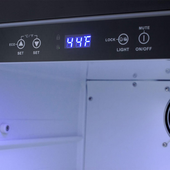 Inside, the SPR623OS offers maximum convenience with frost-free operation that eliminates the need to manually defrost the unit. Fan-forced cooling ensures the temperature stays consistent. The clean white interior and LED lighting provides a refreshingly bright view, with adjustable glass shelving for versatile storage. The door includes two storage racks ideal for holding condiments. The digital control panel is located inside, with a display switchable from Fahrenheit to Celsius at the touch of a button. This unit also includes an optional Sabbath Mode setting that disables the displays for a period of 96 hours.