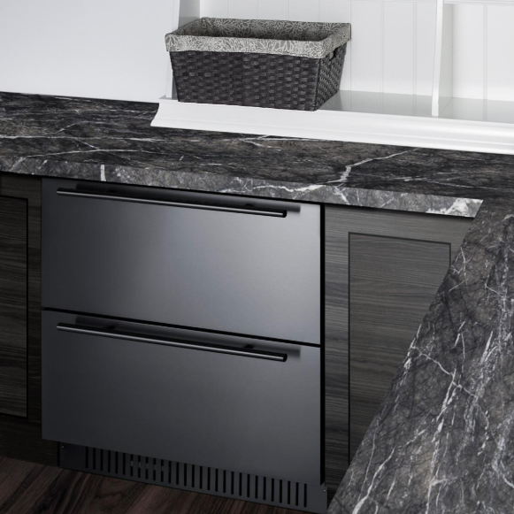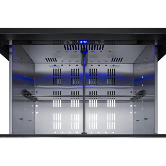 Summit is expanding its popular lineup of built-in undercounter refrigeration with new luxury choices for 27 inches wide spaces in residential or commercial kitchen indoor and outdoor spaces. SPR275OS2D is a 2-drawer all-refrigerator sized just under 27 inches wide and under 24 deep for an easy fit under the counter in any kitchen with limited depth. Stainless steel drawer construction ensures lasting durability and a stunning look to suit any setting, with a set of pro style handles included. The fully finished drawer fronts can also accept overlay panels for a custom look to blend into your own cabinetry. The front-breathing design allows built-in installation, while the fully finished black cabinet also enables freestanding use. The sealed back and right angle plug help to ensure an easy fit. With nearly 5 cu.ft. of interior capacity, the SPR275OS2D is perfect for keeping a variety of items in easy reach. Each drawer includes a removable divider that lets you create four adjustable sections inside to help organize the interior. The intuitive digital control panel features a wide range from 34 to 65 degrees Fahrenheit, allowing you to adjust your storage conditions for standard food items or beverages better held at warmer temperature. The temperature display can be switched from Fahrenheit to Celsius for added convenience. Both drawers feature LED lighting in a striking blue finish for elegant illumination. Frost-free operation minimizes maintenance and internal fans help to maintain an evenly cooled interior. Additional features include open drawer alarms, a child lock to prevent changes to the controls, an eco mode setting, and a 96 hour sabbath mode to disable certain features for periods of observance. The SPR275OS2D features weatherproof construction for safe installation in outdoor kitchens. It is ETL-S listed to NSF-7 commercial standards and also complies with residential regulations for home use.