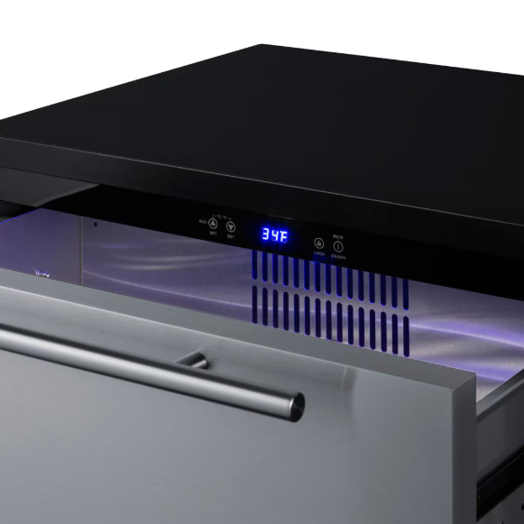 Summit is expanding its popular lineup of built-in undercounter refrigeration with new luxury choices for 30 inch wide spaces in residential or commercial kitchen indoor and outdoor spaces. SPR3032D is a 2-drawer all-refrigerator sized just under 30 inches wide and under 24 inches deep for an easy fit under the counter in any kitchen with limited depth. Stainless steel drawer construction ensures lasting durability and a stunning look to suit any setting, with a set of pro style handles included. The fully finished drawer fronts can also accept overlay panels for a custom look to blend into your own cabinetry. The front-breathing design allows built-in installation, while the fully finished black cabinet also enables freestanding use. The sealed back and right angle plug help to ensure an easy fit. With a generous 5.42 cu.ft. interior capacity, the SPR3032D is perfect for keeping a variety of items in easy reach. Each drawer includes a removable divider that lets you create four adjustable sections inside to help organize the interior. The intuitive digital control panel features a wide range from 34 to 65 degrees Fahrenheit, allowing you to adjust your storage conditions for standard food items or beverages better held at warmer temperature. The temperature display can be switched from Fahrenheit to Celsius for added convenience. Both drawers feature LED lighting in a striking blue finish for elegant illumination. Frost-free operation minimizes maintenance and internal fans help to maintain an evenly cooled interior. Additional features include open drawer alarms, a child lock to prevent changes to the controls, an eco mode setting, and a 96 hour sabbath mode to disable certain features for periods of observance. The SPR3032D features weatherproof construction for safe installation in outdoor kitchens. It is ETL-S listed to NSF-7 commercial standards and also complies with residential regulations for home use.