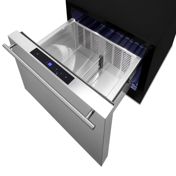 Inside, the FF1DSS has a 1.6 cu.ft. capacity to accommodate your storage needs. Frost-free operation with fan-forced cooling ensures even temperature distribution with minimal user maintenance. A digital thermostat, located atop the refrigerator drawer, makes it easy to manage the temperature, with an LED display that can be read in Celsius or Fahrenheit. Two removable dividers let you separate the drawer into one, two, or three zones to accommodate a variety of sizes. LED lighting affords a convenient view of store contents, while a child lock will disable the digital controls after two minutes of inactivity to prevent accidental adjustments. Additional features include audible alarms for high-temperature fluctuations and open drawer alerts, while a temporary memory function helps to recover all settings in the event of power loss. The Sabbath Mode setting disables certain electrical features during periods of religious observance. With its fully featured, weatherproof design, the FF1DSS is the perfect cooling compartment or beverage holder in outdoor or indoor home kitchens, as well as hotel spaces, foodservice areas, and more.