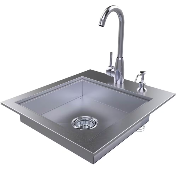The Sunstone 20 Inch ADA compliant contemporary styled drop-In sink is hand-built with food-safe all 304 stainless steel 18-gauge materials. It is designed as a zero radius, rectangular shape, measuring 22.5 L X 20.5 W inches, with a 4 Inch deep single sink basin all with angled top edges complimenting as a modernistic element to your outdoor kitchen. The shallow sink basin is ideal for a wide range of uses and include sturdy covers which help keep outside debris from getting in. The sink package includes everything you need – hot/cold faucet, soap dispenser, removable lid, and a kitchen sized sink drain, also adaptable for most garbage disposals. The sink is designed to blend perfectly with most other brands, BBQ grills and components with its even toned #4 horizontal light brushed finish and polished chrome handle.