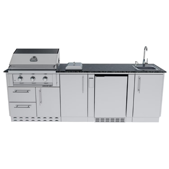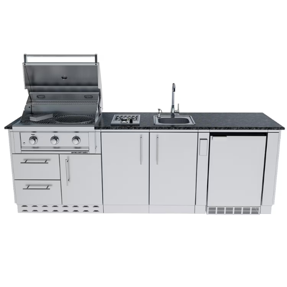 The Bayou 8 Foot 6 Inches Propane Island Package built with premium 304 stainless steel, this package includes a powerful Ruby Series 3-Burner Grill, a high-performance single burner, an outdoor-rated refrigerator, a premium drop-in sink, and spacious modular cabinetry. With easy DIY assembly, you can customize your outdoor kitchen in hours, not days. Please note: Countertop is not included in this package.