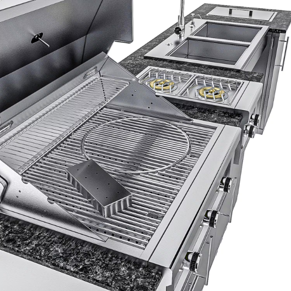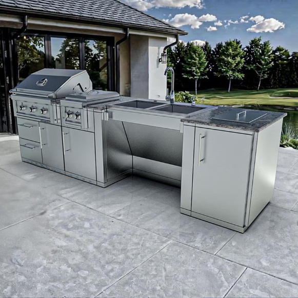 Summit ADA-Compliant Propane 10ft Stainless Steel Island Package- this Outdoor Kitchen Island is thoughtfully engineered to meet ADA (Americans with Disabilities Act) compliance, ensuring ease of use for individuals with disabilities, including wheelchair users. With adjustable height options, spacious open-access cabinetry, and a modular, snap-together design, this kitchen seamlessly blends inclusive design with high-end performance. Please note: Countertop is not included in this package.