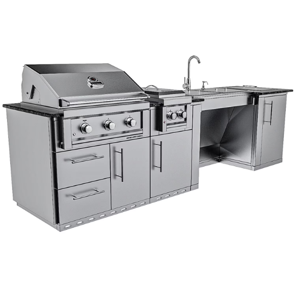 Sunstone Grills Summit 10 Ft Outdoor Kitchen Island w/ Propane Grill & Side Burner, Sink, Door & Drawer