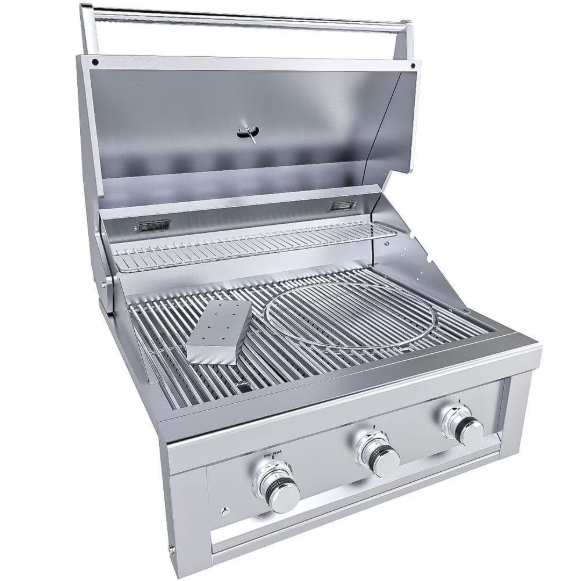 RUBY SERIES by SUNSTONE – This 30-Inch 3-Burner Built-In Natural Gas Grill is the Pinnacle of Grills, built with ALL 304-grade stainless steel construction, seamless edging, and eye-catching features. Exclusive ALL 304 SS Fabricated I-Burners with an output of up to 60,000 BTUs all with integrated independent Flame-Thrower Ignition in ALL burner positions. The cooking grids are Solid 304 Stainless Steel, with Exclusive Variable Rod Spacing on the circular inset grate, grill larger items on the left and right sides and smaller items in the middle like hot dogs, even turn the grate so bars run horizontal and grill your own way. The cooking grids are designed for endless upgradability with multiple upgrades possible like the Pizza Stone, Griddle, Charcoal Tray, Deep Fryer, or Sear Pro Grate, even add an extra Warming Rack or up to two Rotisserie Rods at the same time. Compliment all this with the interior halogen lighting, great for evening grilling and exclusive LED lighting effects on the front control panel change from a cool-blue light to White, Orange, and finally to a deep-red light as the grills temperature increases by a rate of up to 150 degrees per minute. With Sunstone Ruby Grills LED Lights, you will know exactly when your grill is ready to barbeque. Included Smoker Box,Rotisserie Rod with Motor, and Spikes. All Construction Materials & Components are made with Solid 304 Stainless Steel – Engineered and Designed in the USA, by the grilling experts of Sunstone.