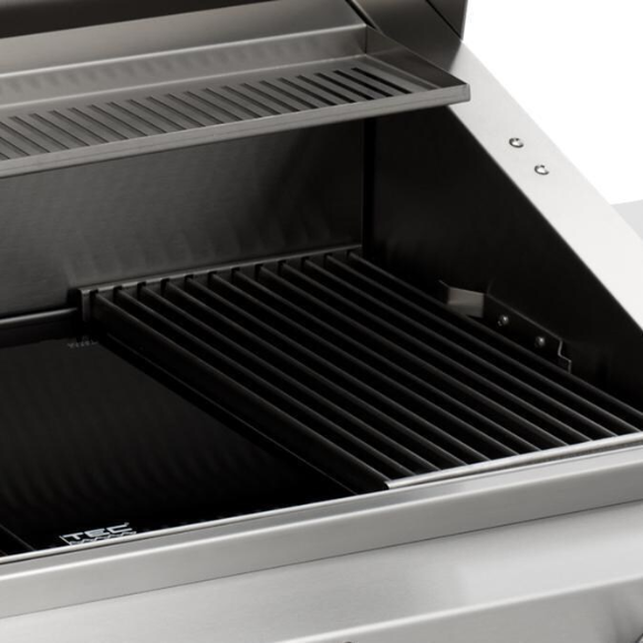 Newly improved from TEC, the Sterling Patio FR series of grills is better than ever! Featuring an innovative grilling system capable of cooking from a searing hot 900 degrees Fahrenheit, down to a low 200 degrees, great for low-heat smoking, searing, and everything in between. The TEC Sterling Patio FR 44-inch propane gas grill cooks with 100 percent infrared energy with no hot or cold spots, eliminating hot air and reducing moisture loss in food by up to 35 percent. Two fuel efficient 30,000 BTU burners use less fuel than other grills, saving you money on gas. Convenient electronic ignition supplies a reliable spark to ignite the burners safely. TEC uses a patented flare-proof stainless steel infrared burner system combined with a radiant glass emitter panel, resulting in tender, juicy, charbroil flavored food. The position of the stainless steel cooking grates, radiant glass panels, and infrared burners creates even heat distribution across the cooking surface and virtually eliminates flare-ups. The 592 square inch cooking surface is covered by unique, U-shaped cooking grates which heat very quickly, delivering restaurant-style sear marks on your food. A stainless steel heat zone separator sits between the burners, which allows you to cook food simultaneously using different temperatures. The separator prevents heat from spilling over to the other side, allowing you to cook using indirect heat. TEC Sterling Patio grills are capable of heating up to 900 degrees in 10 minutes with the hood closed, making long preheating times are a thing of the past. The need for a side burner is also eliminated because you can place your pots or pans on the cooking grids or radiant panels to heat and cook like on an indoor cooktop. Enjoy quick and easy cleanup, with a self-cleaning cooking surface that incinerates food and debris in 10-15 minutes while the grill is on high. Handcrafted in America, this 44-inch built-in grill features a sleek, contoured double-lined hood and thick gauge, 304 grade stainless steel with red metal control knobs. All TEC grills are CSA certified.