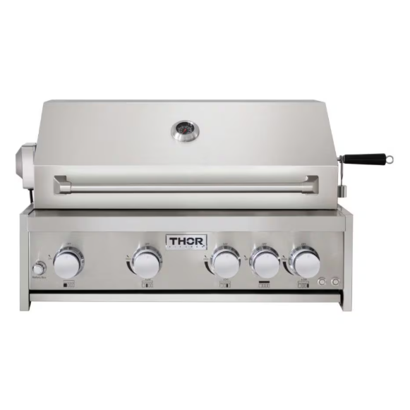 The THOR Kitchen 32-Inch 4-Burner Propane Grill is designed to sit on top of and connect to our 32-Inch Grill Cabinet. This powerful grill has one 13,000 BTU infrared burner and three 12,000 BTU tube burners, giving you full control to create hot and cool areas on your ‘que. It also features a 10,000 BTU rear infrared rotisserie burner, because rotating a bird keeps it juicy. The brilliant blue LED knob lights add a bold, stylish touch to your outdoor setup.