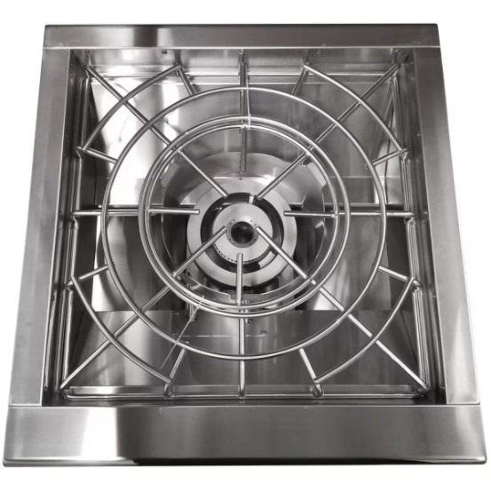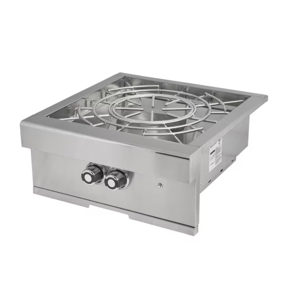 Expand the cooking versatility of your outdoor kitchen island with Turbo side burners. This natural gas power burner is made with durable, 304 stainless steel and features a stainless steel dual ring burner with independent controls for flexible heat control. The dual ring burner give you the freedom to simmer with low heat using one burner or use both burners to quickly bring large pots to a boil with 60,000 BTUs of cooking power. A stainless steel cover is included for added protection when not in use. Ignition is made easy with push and turn knobs that offer a reliable flame with every start and the full-width drip tray makes cleanup a breeze. Blue LED control panel lighting provides added visibility for cooking and entertaining any time of day.