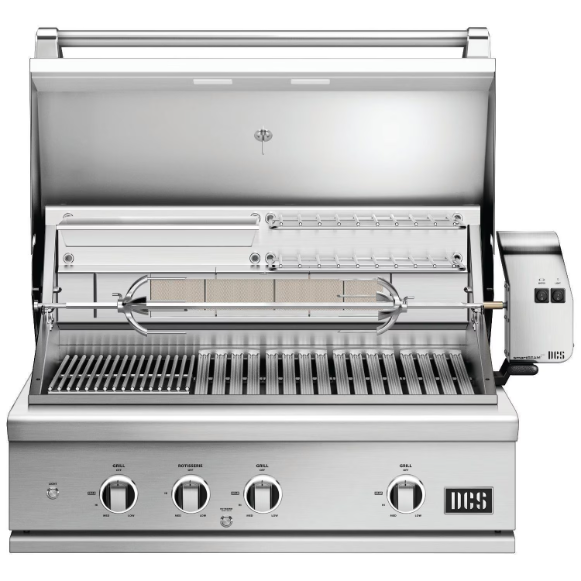 DCS grills are engineered for people who want to cook just like a professional chef in their own home. This 36-inch Natural gas built-in grill features three 25,000 BTU U-shaped stainless steel burners that push an impressive total of 75,000 BTUs of cooking power. Each burner features a heat shield that directs heat upwards, maximizing grilling efficiency. DCS grills offer Ceramic Radiant Technology, which is a layer of ceramic rods placed between the burners and cooking grate. The rods provide intense, yet even heat, ensuring the temperature is consistent across the entire grilling surface. This innovative feature allows you to sear meat to perfection anywhere on the cooking grid. This grill boasts an 630 square inch main cooking surface with durable, double-sided cast stainless steel cooking grids. One side has a gentle curve which supports and handles fish and vegetables. The other side of the grates accommodates steaks and other cuts of meat, capturing grease while creating perfect sear lines. Large food items can comfortably fit on the grill, thanks to a hood designed with extra space and a full 90 degrees of movement. DCS Series 9 grills feature a wider range of cooking temperatures with valves that can be turned down to as low as 300 degrees at the grilling surface. The patented Grease Management system effectively channels grease and oil away from the flame while grilling, which greatly reduces flare-ups. The 14,000 BTU infrared rear burner functions perfectly for slow-roasting, and the included rotisserie kit can accommodate up to 50 lbs! The rotisserie is not in use, the spit rod can conveniently be stored under the drip pan handle. The charcoal smoker tray includes its own cooking grate and can easily be placed over one of the burners. Simply remove one of the cast stainless steel cooking grids and ceramic rod trays, then place the charcoal smoker box over the burner. Either grill directly over it, or fill it with wood chunks to add more smoke to everything on your grill. This grill has a multi-level warming area with 2 warming racks and a broiling pan that can be rearranged to suit your needs. This gives you 534 square inches of additional versatile cooking area. The push and turn hot surface ignition operates with the ease of an indoor range, while intuitive lighting from a 40-watt halogen Smart Beam BBQ grill light, as well as the two hood lights, add visibility while you grill. LED lights in the knob bezels glow white when the grill is on, and orange when that specific burner is in use. The temperature gauge allows you to control cooking temperatures. Every DCS grill is handcrafted and constructed entirely of heavy gauge, type 304 stainless steel.