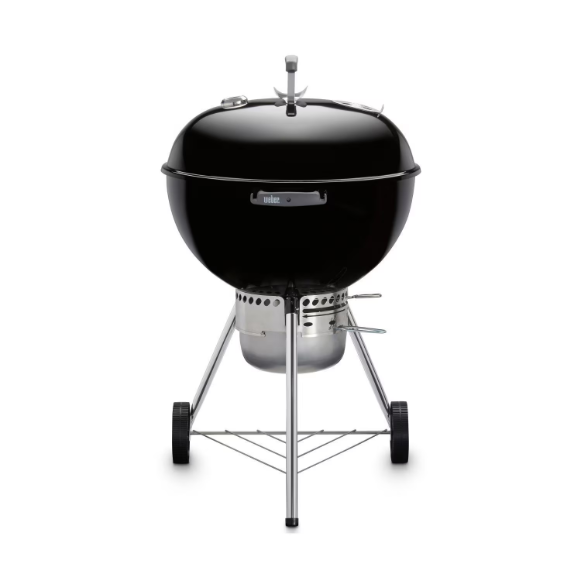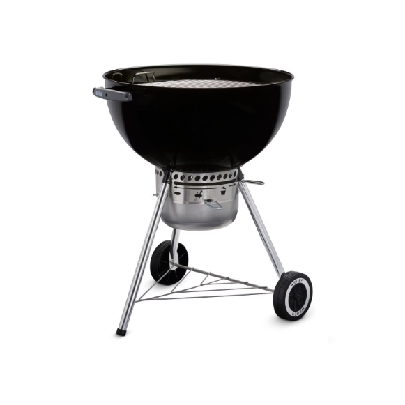 Experience the charcoal revolution that started it all with a Weber kettle-style BBQ grill! Weber kettles combine traditional, iconic design with innovation in production and versatility. Made of premium-grade U. S. Steel coated with porcelain enamel inside and out, the bowl and lid of the Weber Original Premium charcoal grill are precisely formed to allow heat to circulate evenly inside the grill and across the 363 square inches of cooking area. The black porcelain-enamel coating is baked on, fusing the finish to the steel to prevent rusting and peeling through years of use. The aluminized steel One-Touch cleaning system makes clean-up hassle free. As you rotate the handle, three blades in the bowl move ash through the vents and down into the removable, high-capacity aluminum ash catcher below, which is enclosed to prevent ashes from blowing away and creating a mess. Only the unburned coals remain in the bowl and can be re-lit for your next barbecue, which helps you save money on fuel. The adjustable, no-rust aluminum top vent provides the proper airflow needed for perfect grilling and, along with the built-in thermometer, helps you to control the temperature inside the grill. Weber Original Premium grills also feature hinged plated steel cooking grates, for easily adding more charcoal, three glass-reinforced nylon handles that will withstand the elements for the life of the grill, two of which have built-in tool hooks, and a hook that conveniently allows you to hang the lid on the bowl while you grill. Aluminum legs elevate the grill to an ideal height for grilling and two durable all-weather wheels, that are virtually indestructible, make moving the grill easy. A classic, dependable design, the Weber Original Premium Kettle charcoal grill is engineered with the backyard griller in mind!