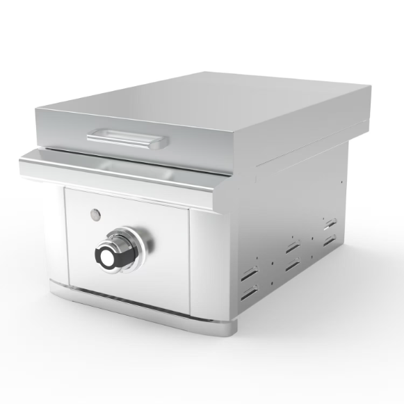 Enhance your outdoor kitchen with the Wildfire Ranch Pro 15 inch propane side griddle, built to deliver professional level performance in a sleek, space saving design. Constructed from high quality 304 stainless steel with smooth, modern lines, this side griddle offers a clean, timeless look while withstanding the rigors of outdoor use. A premium 304 stainless steel burner produces an impressive range of heat from 17,000 to 48,000 BTUs, allowing precise control for everything from low temperature cooking to intense searing. The stainless steel cooking surface ensures even heat and reliable results, while integrated heat indicator lights clearly show when the griddle is in operation. LED backlit knob bezels add refined style and improved visibility for nighttime cooking. Designed for lasting durability and polished aesthetics, the Wildfire Ranch Pro 15 inch Side Griddle is a versatile and sophisticated upgrade for any outdoor cooking space.